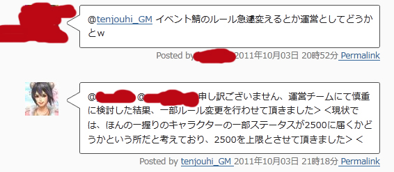 急遽ステータスの上限を設定した運営の、ツイッターにおける言い訳を見てみましょう